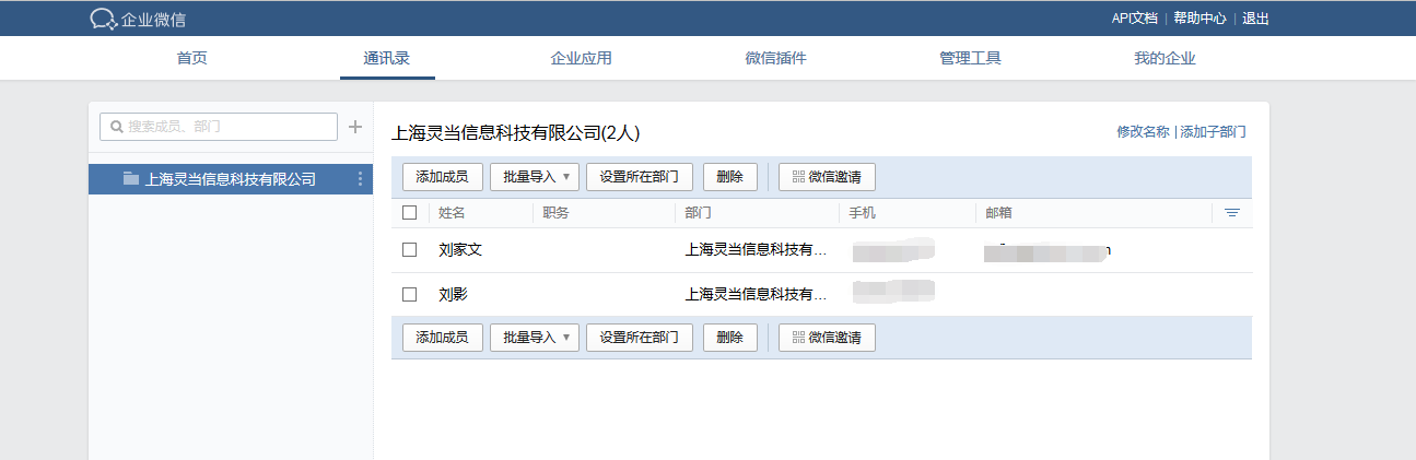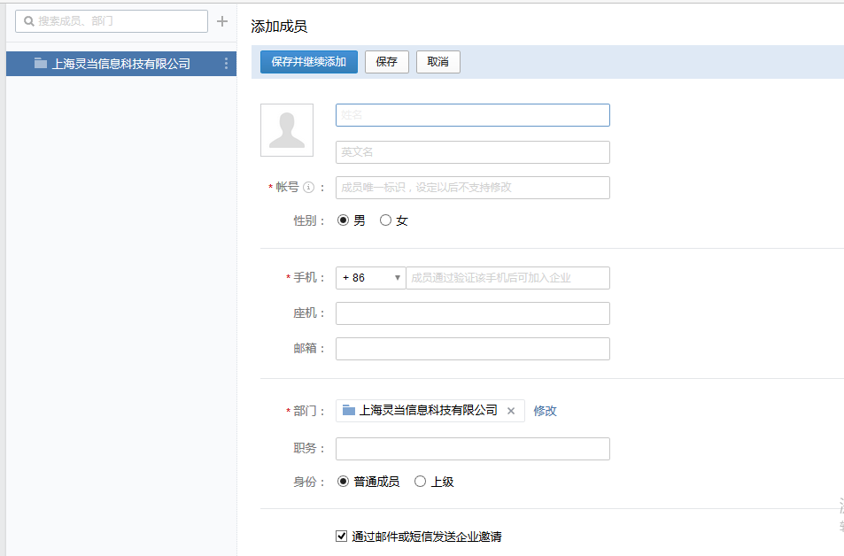 添加成员,设置成员姓名、账号、手机号等信息,可通过邮件或短信发送企业邀请
