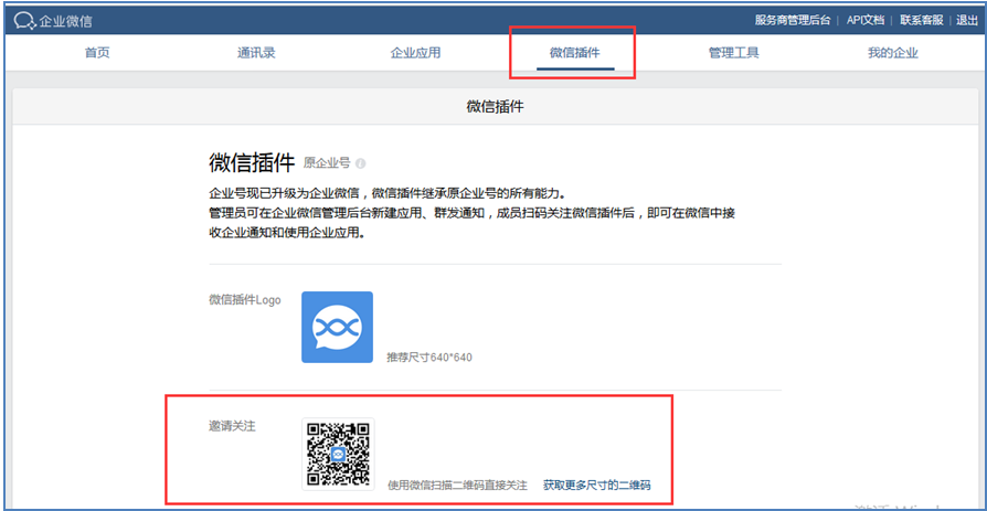 1. 管理员进入企业微信后台下载微信插件的二维码(微信插件->邀请关注二维码)