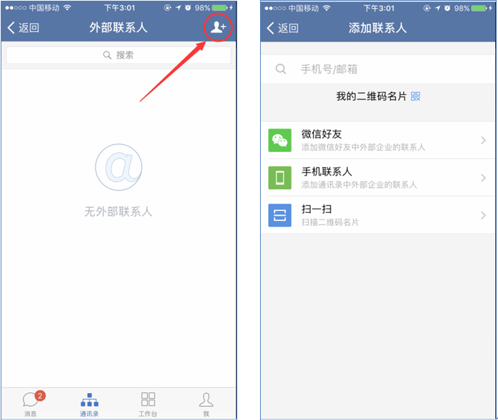 2) 点击右上方的添加图标(a) 三种方式:微信好友、手机联系人、扫一扫,添加好友)