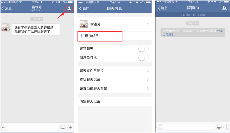 7) 点击发消息,可以建立群聊,然后点击添加成员,再选择其他成员即可