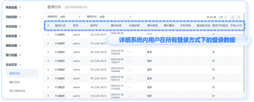 登录日志:记录系统内用户在所有登录方式下的登录数据,企业可追踪和监控用户的登录行为,及时排查异常登录情况