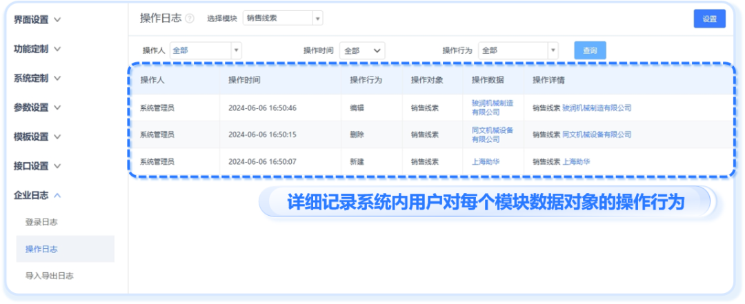在助华CRM的后台设置中,我们可以看到详细的企业日志。