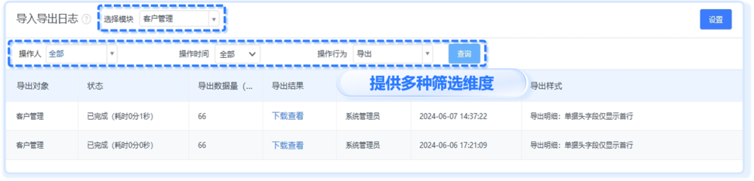 导入导出日志:记录了有相关权限用户的导入导出操作,包括操作对象、状态、时间等,并支持直接下载相关文件。
