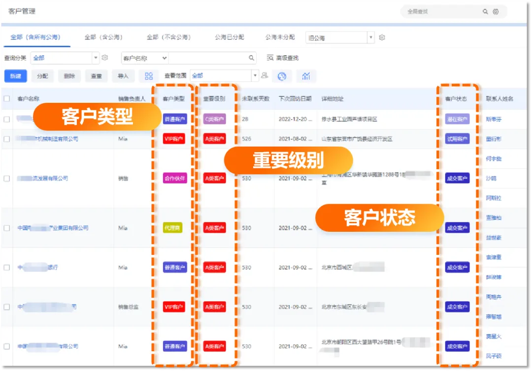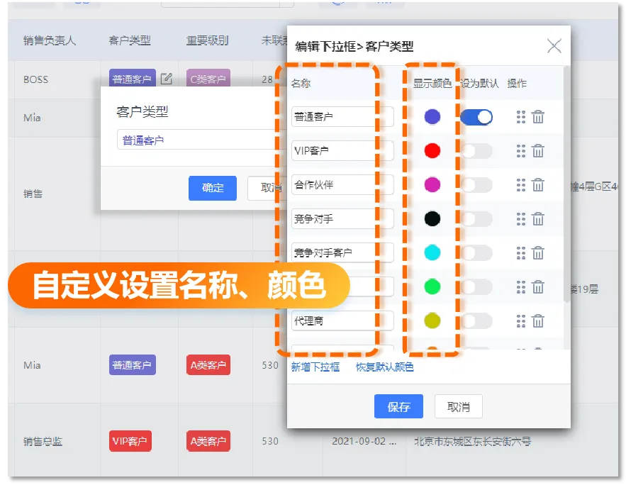 每一个字段都可设置不同颜色进行区分,比如,VIP客户、A类客户用亮眼的红色,便于视觉上快速识别。