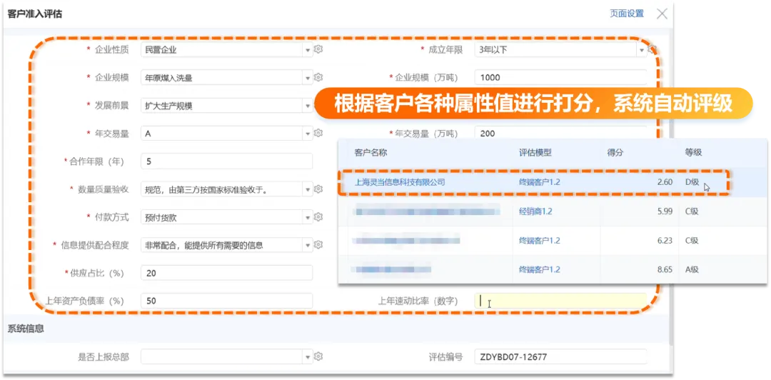 例如,客户所处行业为高科技、企业规模为上市公司、客户关系为伙伴型、合同金额为每年300W以上,则系统自动将其划为A类客户,无须再手动填写。
