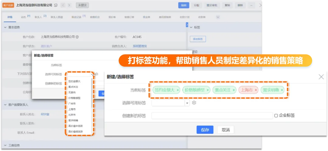 针对这种情况,助华CRM系统的标签功能,可通过客户的多维度行为数据,帮助企业总结客户特点标签,准确定义客户特征,形成客户全景画像,为企业构建客户精细化运营体系打好基础。