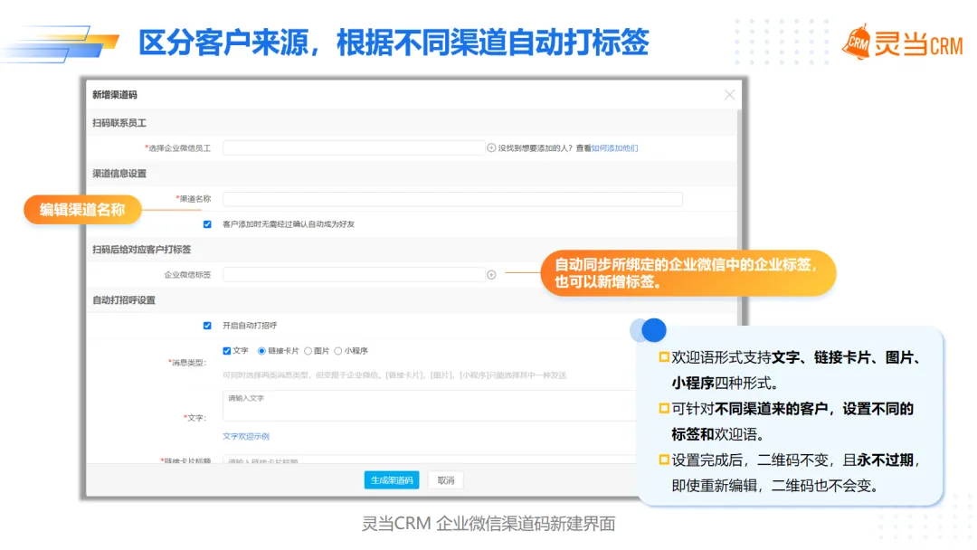 此外,助华CRM系统还支持通过企业微信的渠道码功能实现自动给客户打标签。渠道码通常用于投放推广引流,主要作用是统计各个渠道的引流数据,并且能针对不同渠道来的客户,设置不同的标签。客户一扫码,系统就会自动给该客户打上相应的标签,便于企业快速筛选客户,提高转化率。