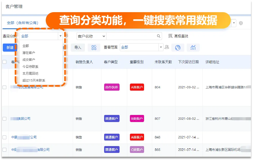 助华CRM支持将常用的一个或一组筛选条件设置为查询分类,方便一键搜索常用数据。