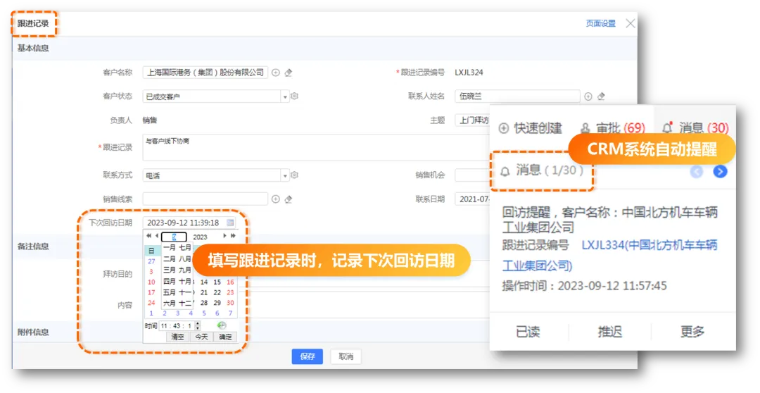 据统计,80%的成功销售是在第4次至第11次跟进后完成的,面对意向客户,按时跟进必不可少。销售人员可以在每次写完跟进记录后,填写好下次跟进的日期,或者使用系统的默认值功能,默认一周后再去跟进回访这个客户。时间临近时,CRM系统将会自动发信息提醒销售人员,及时跟进客户,避免销售遗忘。