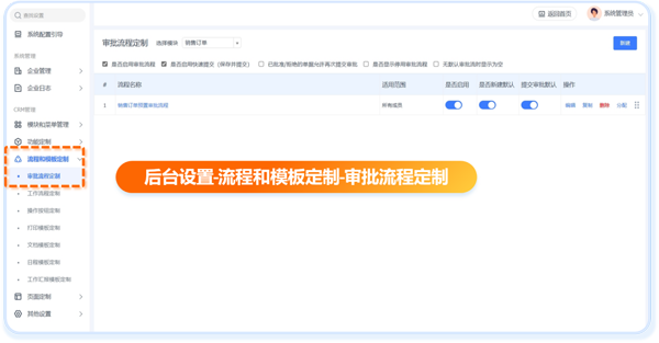 系统管理员登录助华CRM,从后台设置-系统定制,即可进入到审批流程定制界面: