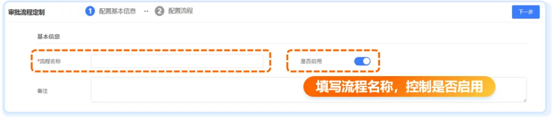 完整的审批流程设置包括“配置基本信息”与“配置流程”两大步骤: