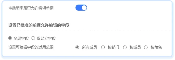 1.审批结束是否允许编辑单据:通常情况下,员工不允许随意篡改通过审批的单据,但对于一些特殊的业务,需要审批结束后再补充填写部分信息,这种情况就可以开启这个参数。为了精准控制可以操作的字段,我们可以设置允许编辑全部字段还是部分字段、设置只允许哪些成员进行编辑,实现严格的数据安全性管控。