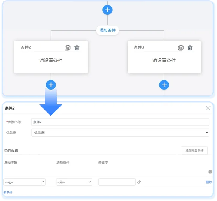 1.若添加条件分支,则可以对每一个分支进行具体的【条件设置】,控制单据在审批流里具体走哪一步。在设置触发条件的时候,可灵活选择单据内的所有字段做逻辑判断,如指定字段关键字、指定数据条件、指定日期区间等,也支持多种组合条件,帮助企业实现复杂的触发场景。设置条件后,只有满足条件,才会流转到此步骤的审批人。