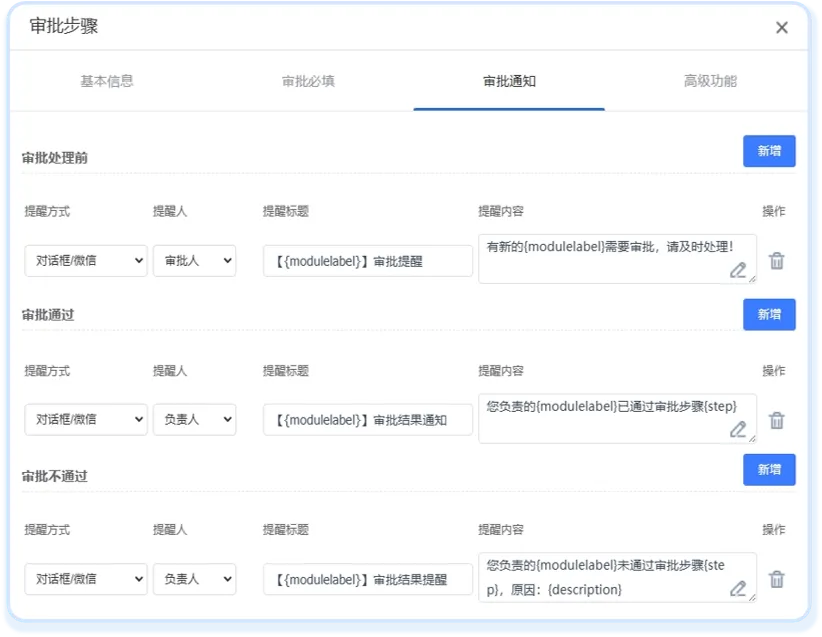 在审批通知的页签下, 可以自定义提醒方式、提醒人、提醒标题和提醒内容,确保审批人和负责人能够及时收到审批消息的提醒。