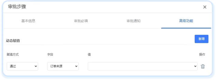 在高级功能页签下,可设置根据审批结果自动给单据字段赋值。
