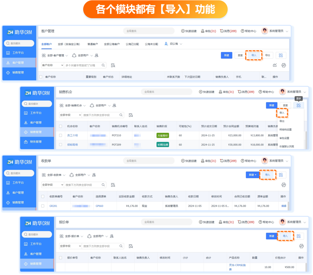 在助华CRM系统中,几乎所有模块都有【导入】功能。