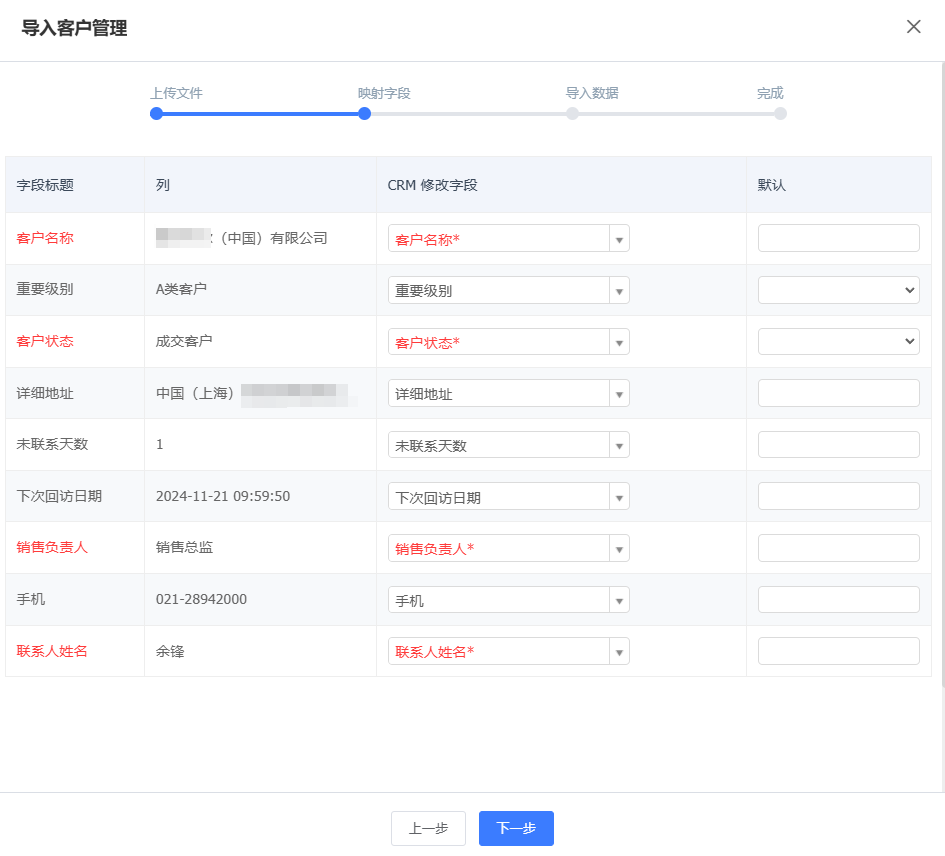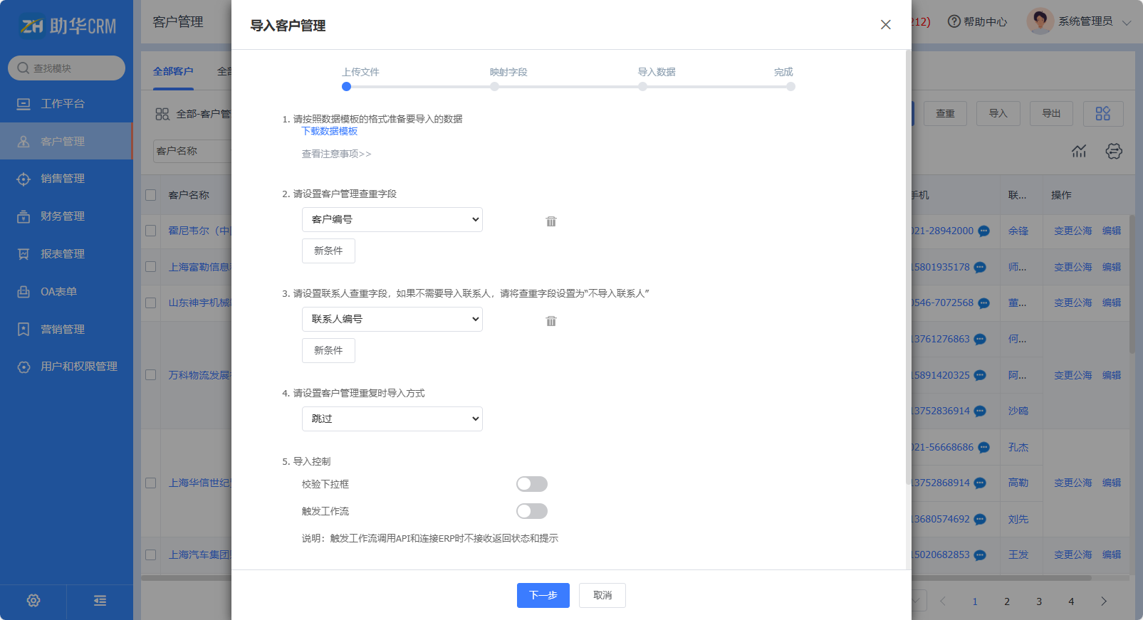 如果数据模板里的字段名称和CRM里面的字段名称不一致,可以自定义设置excel表格与系统中字段的一一对应关系。