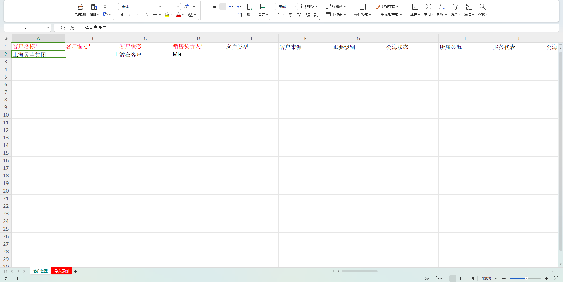 打开模板,可以看到必填字段有星号标注,必须保留并且不能为空请勿删除必填字段,且销售负责人必须是系统里的存在的用户。我们还提供了导入示例,能帮助您了解如何录入数据。
