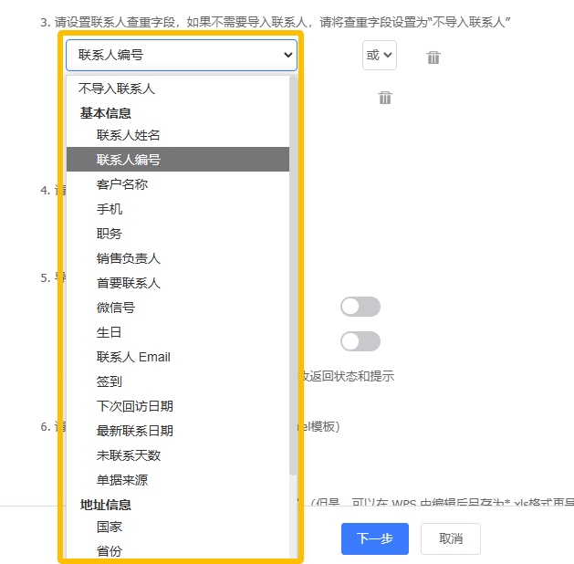 同理,联系人信息也可以设置查重字段。如果不需要导入联系人,请将查重字段设置为“不导入联系人”