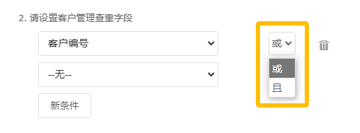 查重字段可选择客户模块内的任一字段或多个字段,如有多个字段作为查重条件的话,字段关系分为“或”和“且”两种