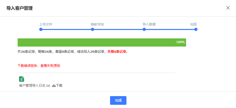 导入完成后系统弹窗将显示导入结果,导入记录条数等(包含成功条数,失败条数),针对导入失败的数据,支持下载错误报告,查看失败原因。