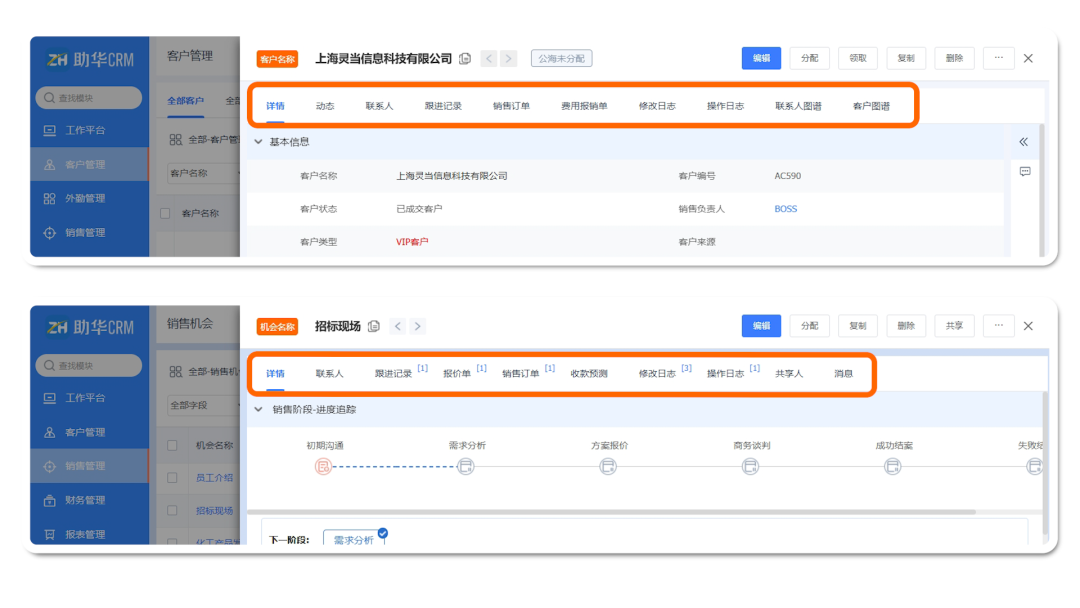 发布时间:2024-12-11 09:14:19作者:在助华CRM里,客户管理和销售机会管理是两个至关重要的模块,我们能通过这两个模块的相关信息栏,快速看到所有相关的下游单据(如跟进记录、联系人、销售订单、服务合同),360度了解全景信息,实现更高效的工作流程和决策制定。