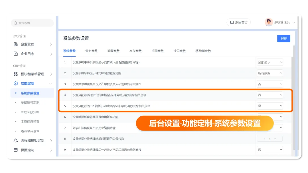 助华CRM的系统参数设置里,有两个客户和销售机会模块分配、共享参数:1. 设置分配/共享客户信息时是否允许同时分配/共享相关信息2. 设置分配/共享销售机会时是否允许同时分配/共享相关信息
