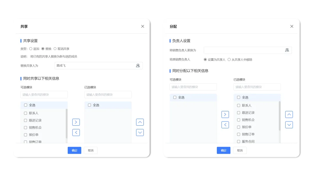 这两个模块也经常涉及信息交接(即变更负责人),特别是员工离职时,需要快速交接客户、销售机会及所有相关下游单据,确保业务连续性和数据完整性。