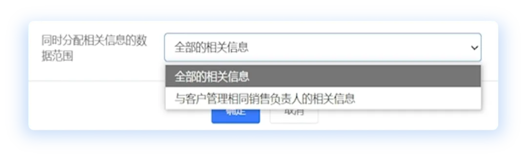 “与客户管理相同销售负责人的相关信息”:只分配与当前客户销售负责人创建的相关信息,不分配其他成员创建的。