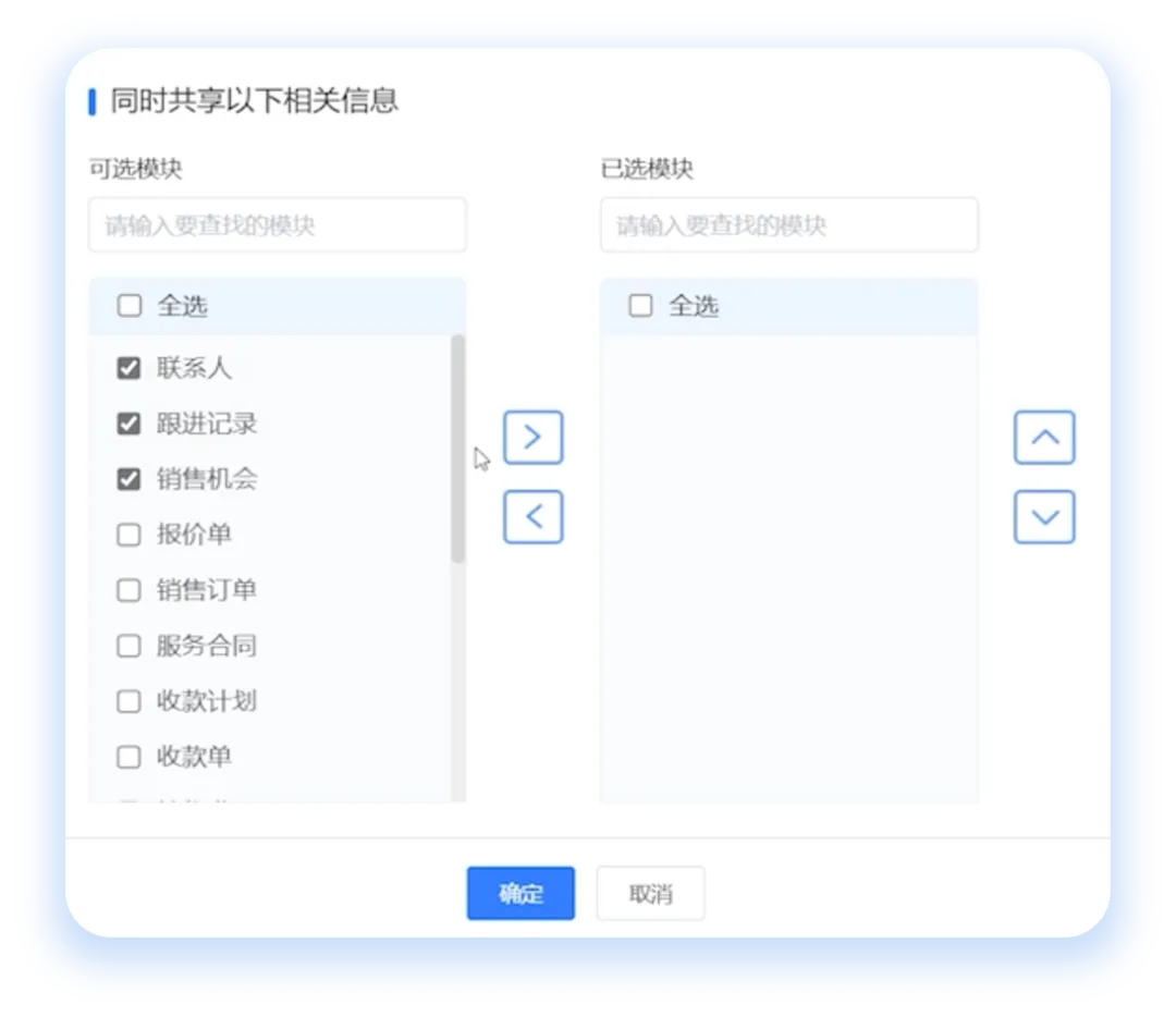“分配或共享部分”:能够选择指定模块进行分配或共享;