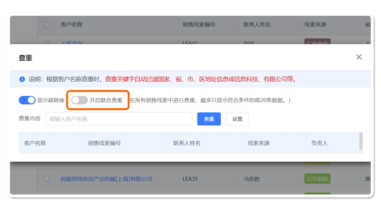 为了解决这一痛点,现在,助华CRM支持联合查重了!